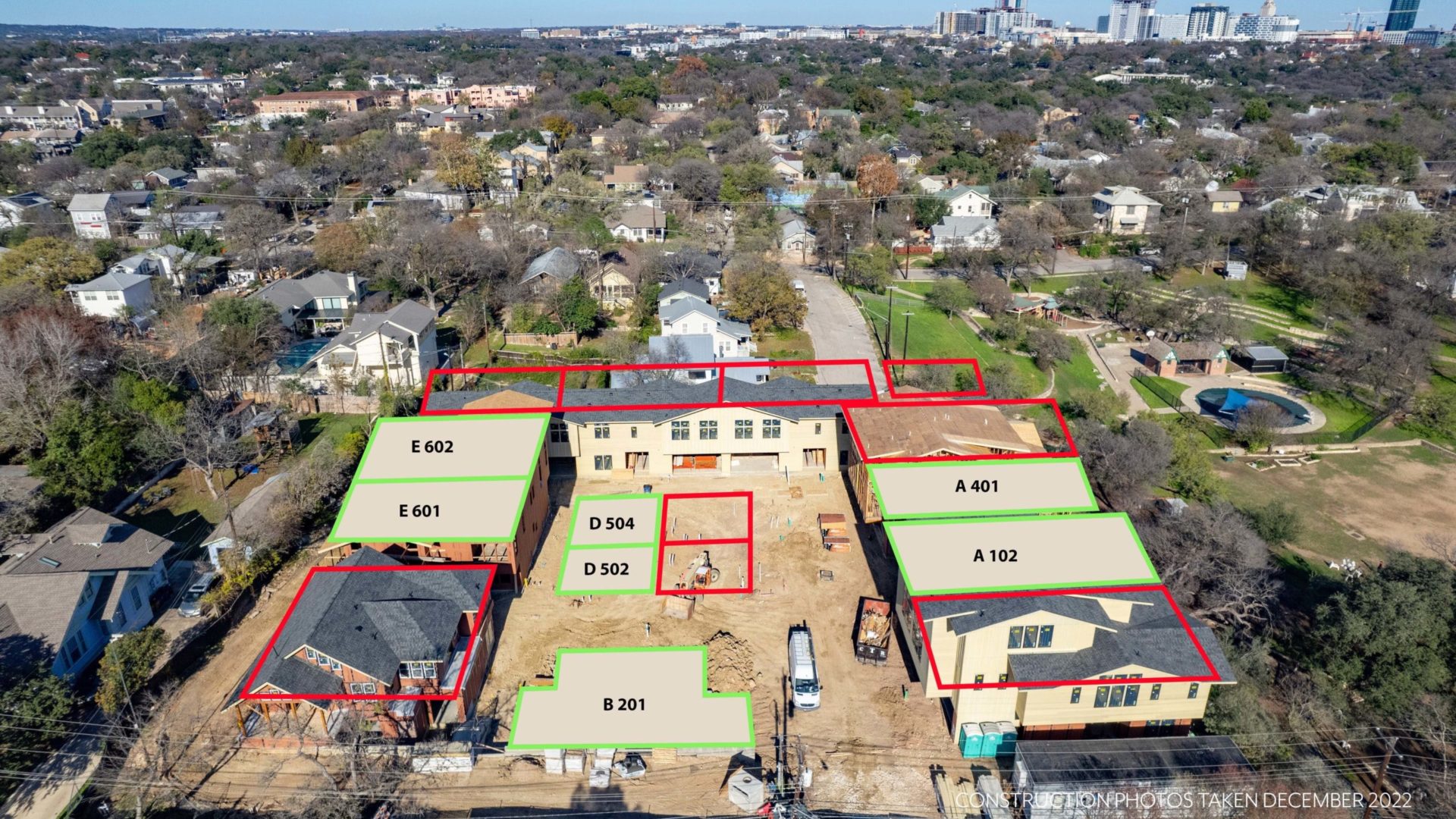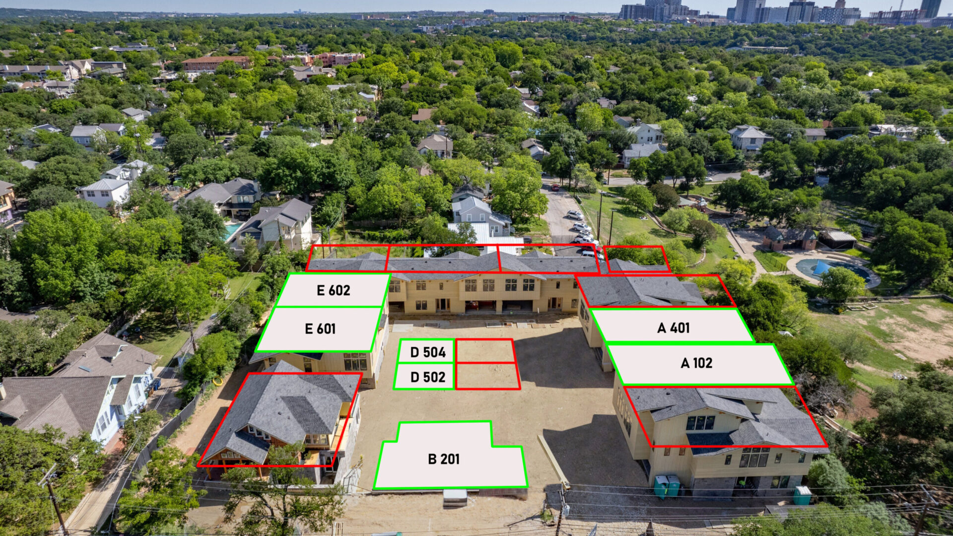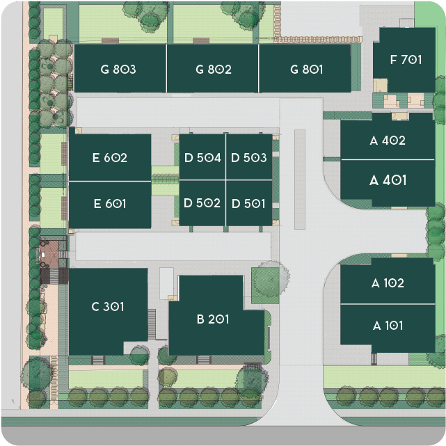 Hover over the units below for more information such as bed+bath count, unit size & pricing. Click the units to download the floor plans!