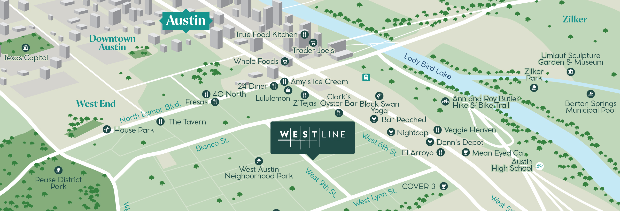 This pedestrian friendly district is known for its historic bungalows, public parks, and popular cafes and shops. Located minutes from downtown Austin and surrounded by a variety of restaurants, the Westline community offers an accessible lifestyle to West Austin Neighborhood Park, the Hike & Bike Trail, Lady Bird Lake, Whole Foods, Trader Joe’s and convenient highway access!